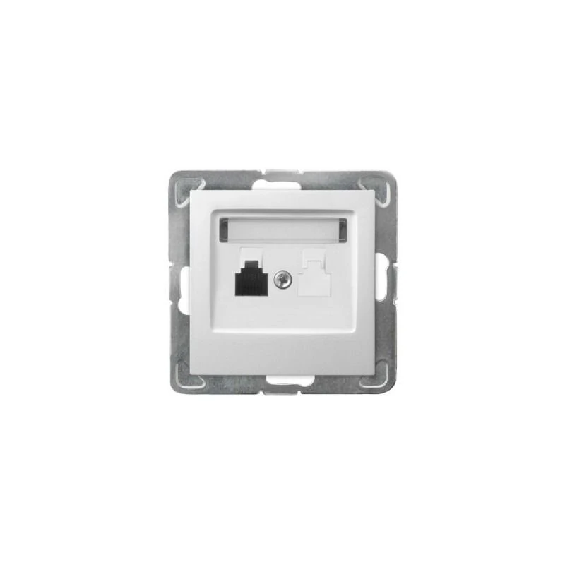 Pojedyncze gniazdo telefoniczne w kolorze białym serii IMPRESJA firmy OSPEL, przeznaczone do montażu podtynkowego. Gniazdo wymaga dokupienia ramki serii IMPRESJA firmy OSPEL.