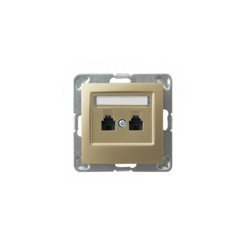 Równoległe podwójne gniazdo telefoniczne w kolorze złotym serii IMPRESJA firmy OSPEL, przeznaczone do montażu podtynkowego. Gniazdo wymaga dokupienia ramki serii IMPRESJA firmy OSPEL.