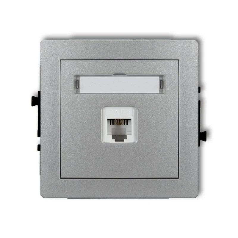 Mechanizm gniazda telefonicznego RJ11 serii DECO firmy KARLIK, w kolorze srebrnym, przeznaczony do montażu podtynkowego. Gniazdo wymaga dokupienia ramki serii DECO firmy KARLIK.