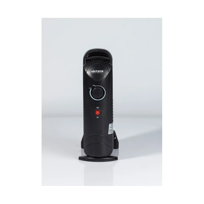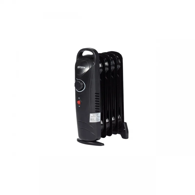 Mały grzejnik olejowy firmy Volteno w kolorze czarnym o mocy 500W. Model tego grzejnika VO0276 posiada 5 żeberek grzewczych. Wbudowane kółka w tylnej części, oraz rączka ułatwiają transport. Grzejnik na prąd z wypełnieniem olejowym charakteryzuje się dłuższym czasem utrzymywania ciepła. Sprawdzi się jako podręczny źródło ciepła w domu lub biurze. Wbudowany termostat pozwala na płynną regulację temperatury grzania.