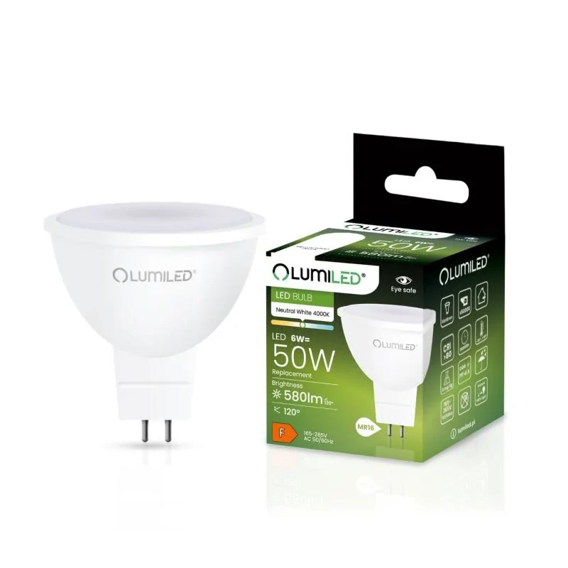 Żarówka energooszczędna LED firmy LUMILED pobiera zaledwie 6W mocy (odpowiednikiem jest tradycyjna żarówka o mocy 50W). Żarówka LED należy do klasy energetycznej F , a jej strumień świetlny wynosi 580 lm. Energooszczędna żarówka firmy LUMILED świeci neutralną barwą światła o temperaturze barwowej 4000K. Wymiary żarówki to 50 x 58 mm i może działać nawet do 50000h oraz 15 000 cykli włączania i wyłączania. Żarówka posiada trzonek GU 5.3. Jej dodatkowe zalety do mleczny klosz idealnie rozpraszający światło, brak efektu mrugania i natychmiastowy zapłon. Model dostępny również w wersji z barwą ciepłą.