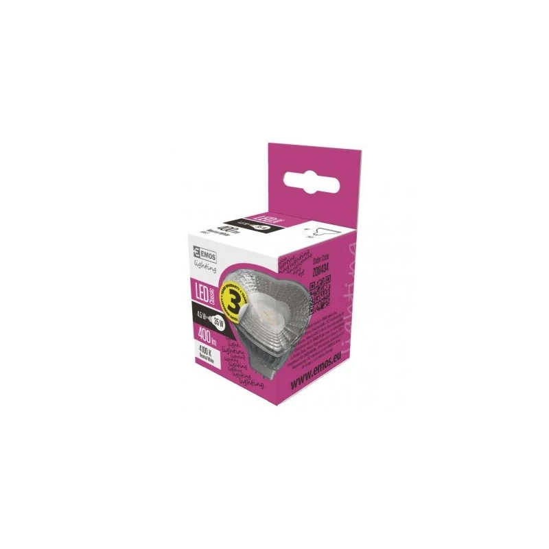 Żarówka LED w kształcie reflektora firmy EMOS o mocy 4.5W - odpowiednik 31W, to niskonapięciowa żarówka MR16 12V. LED-owa żarówka świeci neutralną białą barwą światła, o temperaturze barwowej równej 4000K. Strumień świetlny żarówki LED wynosi 380lumenów, a jej wymiary to: 50 x 46 mm. Żarówka LED wyposażona jest w trzonek MR16 i działa z napięciem 12V. Przybliżony czas działania reflektorowej żarówki LED to około 30000h oraz 25 000 cykli on/off. Kąt rozsyłu światła jest równy 100 stopni. Żarówka posiada 3 letnią gwarancję.