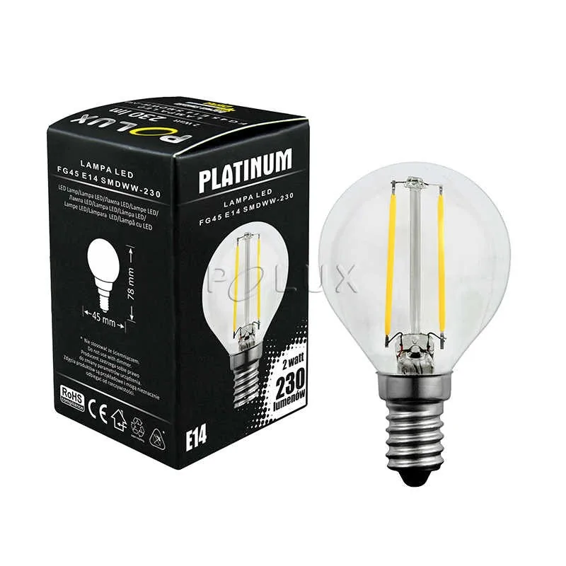 Żarówka led z filamentami marki Polux przystosowana jest do lamp z widocznym źródełm światła. Przezroczysta bańka i umieszczone w niej dekoracyjne filamenty dodadzą uroku każdej oprawie. Prezentowane źrodło światła posiada trzonek E14 i działa z mocą 2W, czego odpowiednikiem jest 23W tradycyjnego rozwiązania. Produkt świeci ciepłym białym światłem o temperaturze barwowej 3000K i strumieniu świetlnym równym 230 lumenów. Przybliżony czas działania żarówki led E14 to około 25000h oraz 12500 cykli on/off.