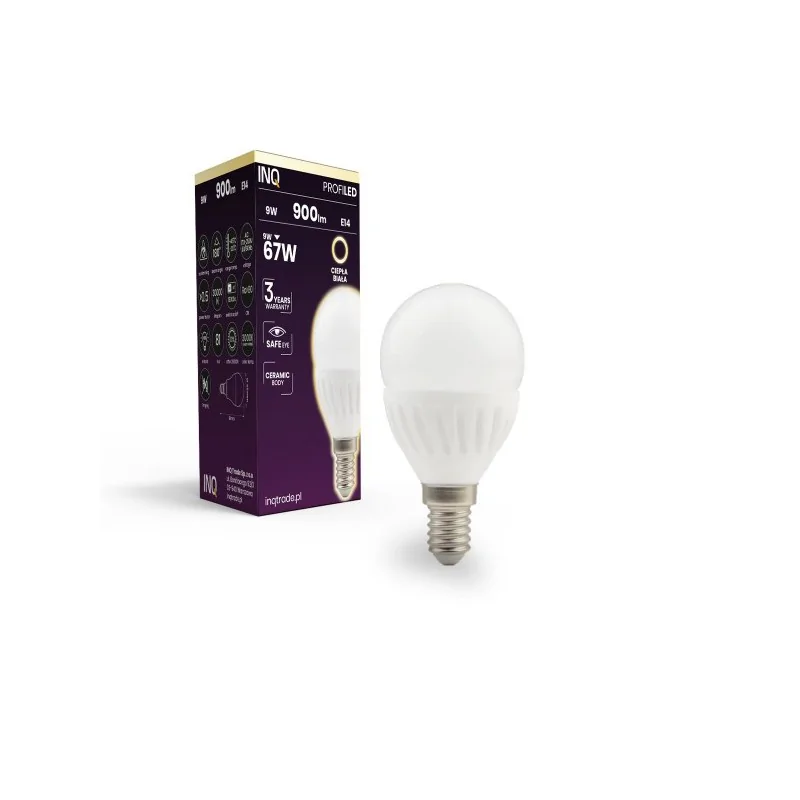 Ceramiczna żarówka LED z gwintem E14 o mocy 9W marki INQ to wysokiej jakości źródło światła o wydłużonym czasie gwarancji obejmującym 3 lata. Ciepła żarówka 3000K o mocy strumienia świetlnego 900 lumenów gwarantuje doskonałe oświetlenie wnętrza tworząc miłą i przytulną atmosferę wokół. Prezentowana żarówka INQ to energooszczędne źródło światła należące do wysokiej klasy energetycznej A+. Żarówka działa aż 35000 godzin przy 15000 cykli włącz/wyłącz. Oświetlenie dostępne również w innych w innych wariantach.