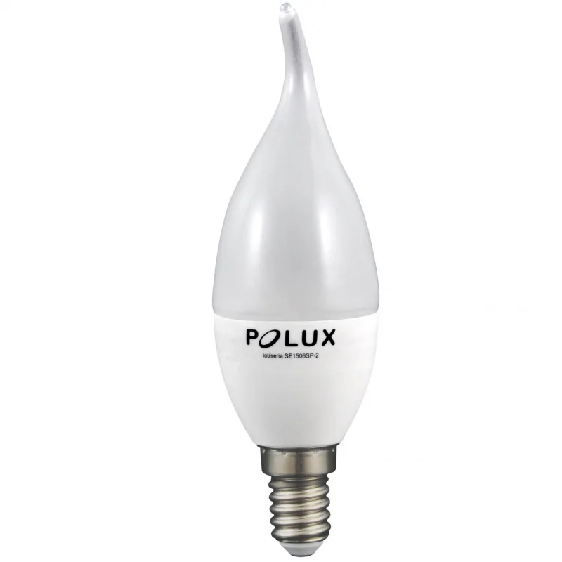Żarówka LED w kształcie płomyka marki POLUX to energooszczędne źródło światła emitujące ciepłe białe światło, które jest przyjemne dla oczu, o temperaturze barwowej 3000K i strumieniu świetlnym równym 560 lumenów. Prezentowany model żarówki świeci z mocą 6,3W, a jej odpowiednikiem jest tradycyjne źródło światła o mocy 45W. Produkt posiada mleczny klosz oraz mały gwint E14, a przez swój oryginalny kształt świetnie spisze się w każdej lampie. Przybliżony czas działania żarówki led E14 to około 25000h oraz 1200 cykli włączeń i wyłączeń.