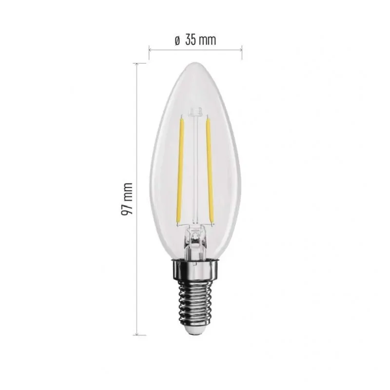 Żarówka LED ZF3201 Emos w kształcie świeczki z wbudowanymi dwoma ozdobnymi filamentami to energooszczędne źródło światła świecące neutralną barwą światła w temperaturze barwowej 4000K i strumieniu świetnym 250lm. Produkt rozsyłać nam będzie światło pod kątem 320°. Żarówka LED o trzonku E14, o mocy 1,8W jest odpowiednikiem żarówki o mocy 25W. Objęta jest 36 miesięczną gwarancją producenta i należy do klasy energetycznej D. Żarówka LED charakteryzuje się długą żywotnością.