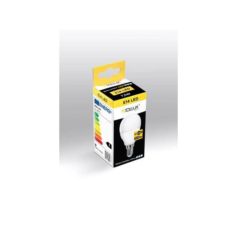 Żarówka LED marki Sollux o kształcie kulki w kolorze mlecznym to energooszczędne źródło światła o gwincie E14. Świeci z mocą 7,5W, a jej odpowiednikiem jest tradycyjne źródło światła o mocy 65W. Przybiżony czas działania tej żarówki to 17000 h. Emituje białe zimne światło o temperaturze barwowej 4000K i strumieniu świetlnym 680 lumenów. Przedstawiona żarówka należy do klasy energetycznej F.