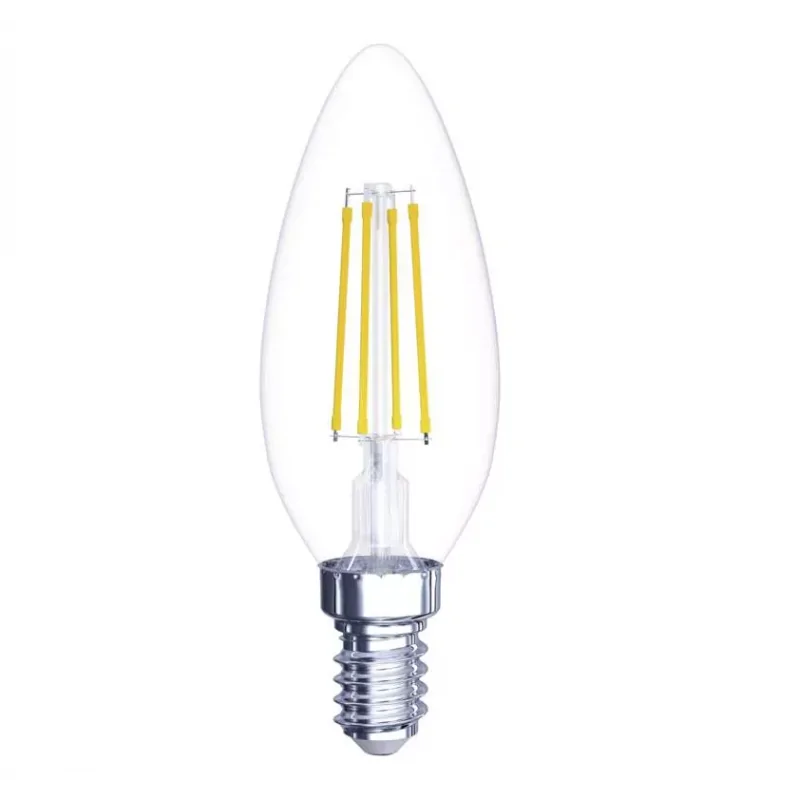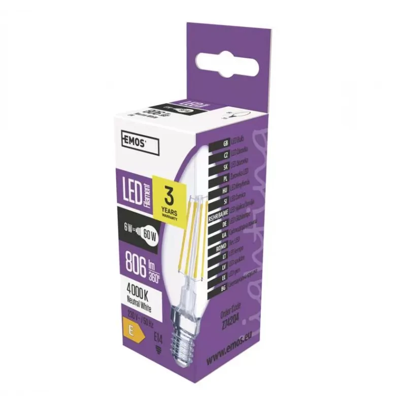 Led-owa żarówka w kształcie świeczki działa z mocą 6W, a jej odpowiednikiem jest tradycyjne źródło światła o mocy 60W. Produkt posiada trzonek E14 i świeci neutralnym białym światłem o temperaturze barwowej 4000K i strumieniu świetlnym 806 lumenów. Żarówka led wyposażona została w przezroczysty klosz, w którym znajdują się dekoracyjne filamenty. Prezentowane źródło światła będzie świetnym rozwiązaniem w lampach z widocznym źródłem światła. Szacowany czas działania żarówki to około 25000h oraz 15000 cykli włączeń i wyłączeń. Żarówka posiada wydłużoną gwarancję - 3 lata.