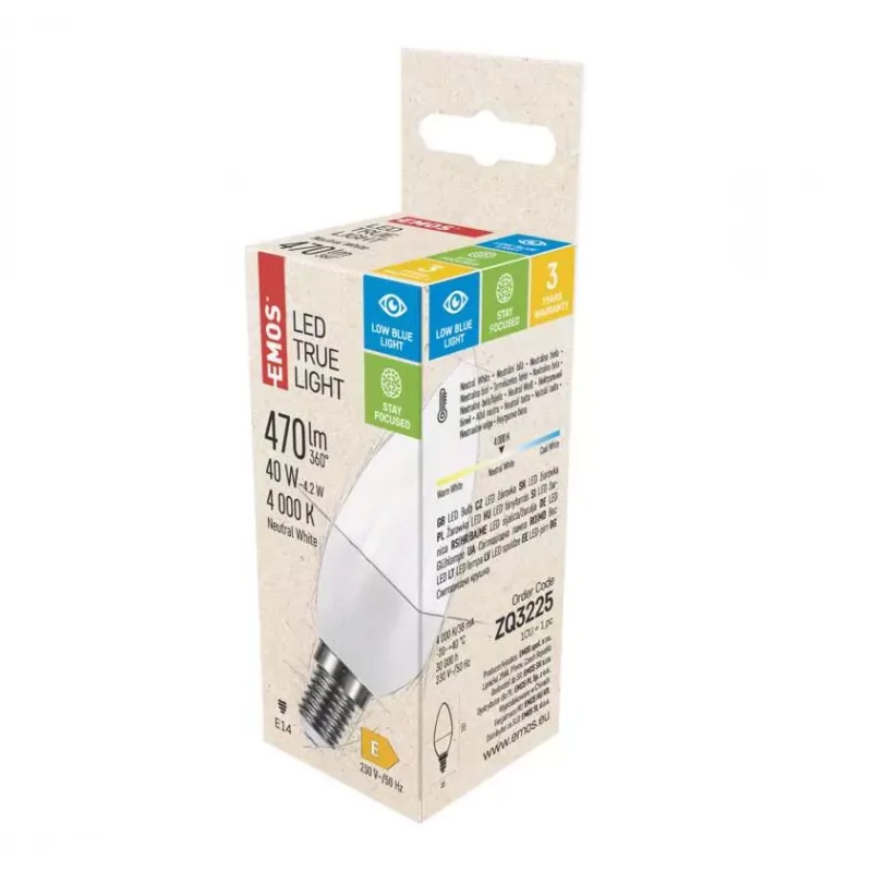 Żarówki TRUE LIGHT wprowadzono na rynek dla Twojego zdrowego stylu życia. Żarówki LED TRUE LIGHT minimalizują emitowane niebieskie światło dzięki specjalnemu układowi Bridgelux Thrive. Żarówki LED TRUE LIGHT minimalizują emisję niebieskiego światła i przyczyniają się do stabilizacji biorytmu człowieka, naturalnie i bez zniekształceń kolorów. Żarówki LED TRUE LIGHT o neutralnej bieli (4 000 K) z ograniczoną emisją niebieskiego światła zapewniają mniejsze zmęczenie oczu niż standardowe żarówki LED. Dedykowane do pokoju dziecięcego, biura, kuchni i wszędzie tam, gdzie wymagana jest duża wydajność pracy, zdolność szybkiego reagowania, uczenia się i rozumienia. Zmniejszenie ilości składników niebieskich i zielonych pozytywnie wpływa na produkcję serotoniny, czyli hormonu szczęścia, który wpływa na nasze myślenie, kreatywność, wydajność i zdolność koncentracji. Funkcja Flicker-free minimalizuje migotanie, zapewniając komfort dla wzroku. Wszystko, co oświetlają żarówki LED TRUE LIGHT, będzie widoczne w realistycznych kolorach i bez żadnych zniekształceń dzięki wysokiemu współczynnikowi oddawania barw CRI>94, który posiadają te nowoczesne i zdrowe żarówki. Led-owa żarówka w kształcie świeczki działa z mocą 4,2W, a jej odpowiednikiem jest tradycyjne źródło światła o mocy 40W. Żarówka posiada wydłużoną gwarancję - 3 lata.
