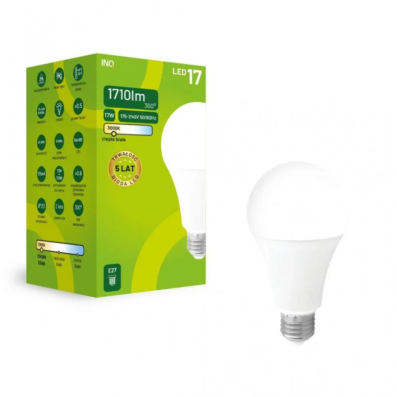 Żarówka LED mleczna E27 marki INQ to energooszczędne źródło światła o mocy 17W, a jej odpowiednikiem jest tradycyjna żarówka o mocy 113W. Produkt posiada klasyczny kształt A70 i świeci ciepłym światłem o temperaturze barwowej 3000K i strumieniem świetlnym równym 1710 lumenów. Źródło światła led z popularnym gwintem E27 o wymiarach bańki: 136x72mm.