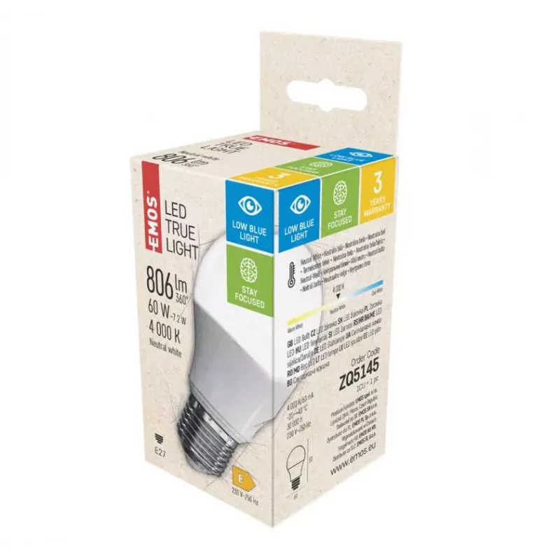 Komfortowa dla oczu żarówka LED True Low Blue Light E27 A60 7,2W neutralna 806lm ZQ5145 EMOS