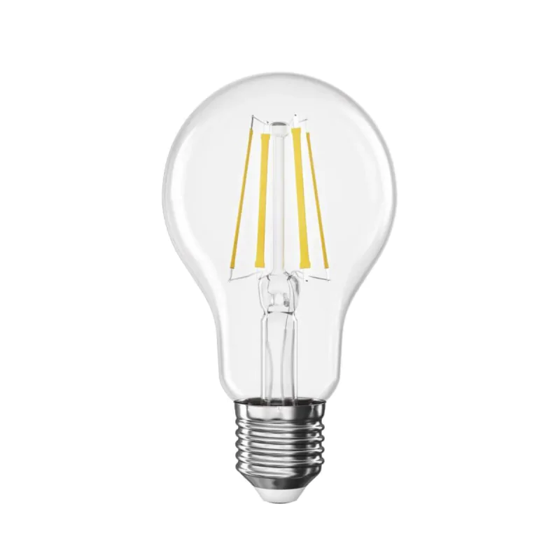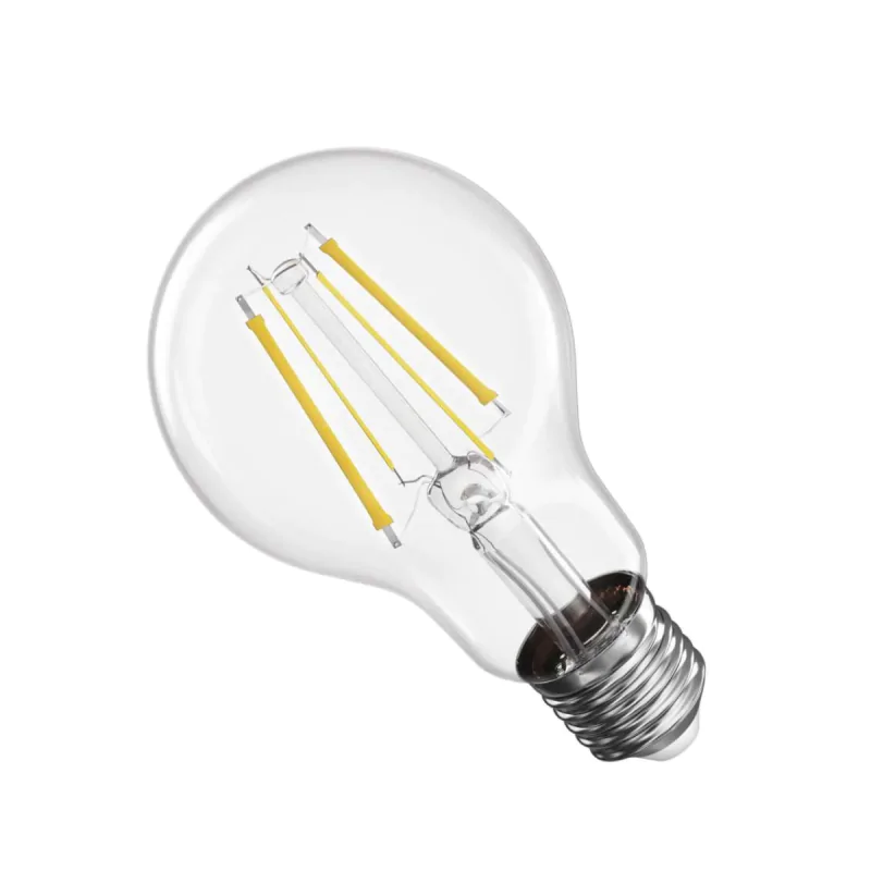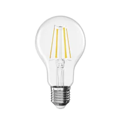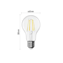 Led-owa żarówka o bańce A60 działa z mocą 5,9W, a jej odpowiednikiem jest tradycyjne źródło światła o mocy 60W. Produkt posiada trzonek E27 i świeci ciepłym białym światłem o temperaturze barwowej 2700K i strumieniu świetlnym 806 lumenów. Żarówka led wyposażona została w przezroczysty klosz, w którym znajdują się dekoracyjne filamenty. Szacowany czas działania żarówki to około 25000h oraz 15000 cykli włączeń i wyłączeń. Żarówka posiada wydłużoną gwarancję - 3 lata. Model dostępny w różnych mocach i barwach. Kąt promieniowania światła do 360 stopni. Model posiada 4 diod led. Żarówki należą do nowej klasy energetycznej D.