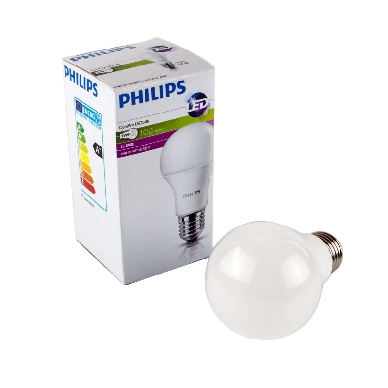 Żarówka LED E27 marki Philips świeci ciepłym, białym światłem 2700K z mocą strumienia świetlnego równą 1055 lumenów. To doskonałe źródło światła do pomieszczeń gdzie potrzebujemy się wyciszyć i zrelaksować. Idealnie sprawdzi się w sypialni czy salonie. Żarówka charakteryzuje się długotrwałą żywotnością. Działa przez około 15000 godzin co średnio daje wynik nawet 15 lat. LED należy do wysokiej klasy energetycznej A+ dlatego też jest to energooszczędne rozwiązanie.