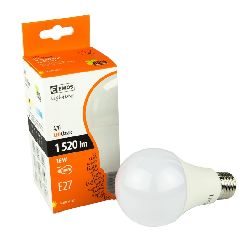 Żarówka LED E27 marki EMOS to energooszczędne źródło światła pobierające do 85 % mniej energii w porównaniu do tradycyjnych żarówek. Szeroki kąt rozsyłu światłości oraz ciepła biała barwa 2700K sprawiają ,że żarówka LED doskonale odnajdzie się w każdym wnętrzu oświetlając całą powierzchnię nie męcząc przy tym wzroku. Żarówka charakteryzuje się bardzo długą żywotnością. Czas jej pracy sięga nawet do 30000 godzin przy 15000 cykli włącz/ wyłącz, dzięki czemu żarówka led EMOS stanowi funkcjonalne źródło światła na długie lata.