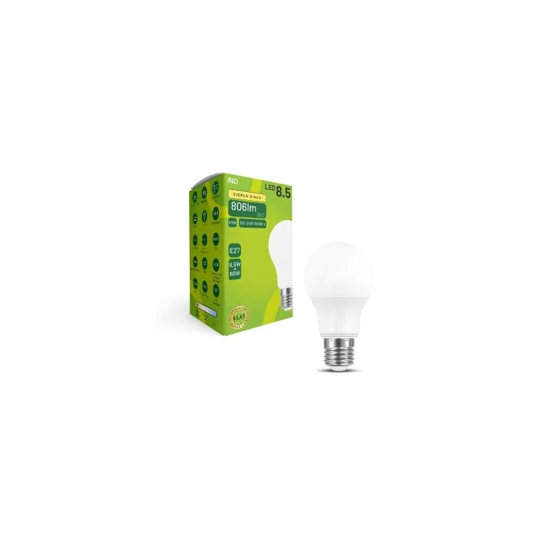 LED-owa żarówka z mlecznym kloszem marki INQ emituje ciepłym przyjemnym dla oczu światłem o temperaturze barwowej 3000K, które doskonale spisze się w pomieszczeniach, w których przebywamy dużo czasu. Produkt jest w kształcie tradycyjnej żarówki A60, a jego strumień świetlny jest równy 806 lumenów. Żarówka LED z z tradycyjnym grubym gwintem E27 działa z mocą 8,5W, a jej wymiary to 108x60mm.
