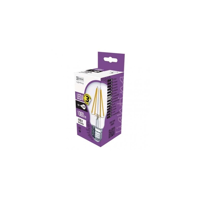 Żarówka w technologii LED o bańce A60 działa z mocą 7W, a jej odpowiednikiem jest tradycyjne źródło światła o mocy 75W. Produkt posiada trzonek E27 i świeci neutralnym białym światłem o temperaturze barwowej 4000K i strumieniu świetlnym 1060 lumenów. Żarówka led wyposażona została w przezroczysty klosz, w którym znajdują się dekoracyjne filamenty. Szacowany czas działania żarówki to około 25000h oraz 15000 cykli włączeń i wyłączeń. Żarówka posiada wydłużoną gwarancję - 3 lata. Model dostępny w różnych mocach i barwach. Kąt promieniowania światła do 320 stopni. Produkt należy do klasy energetycznej D.