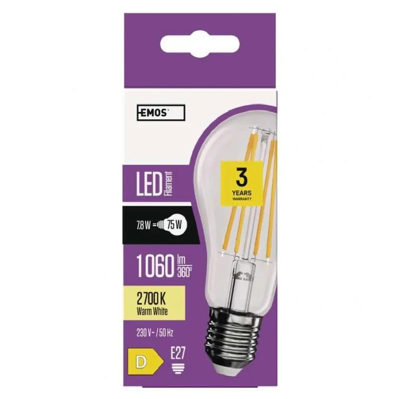 Żarówka LED ZF5150 Emos z dekoracyjnym filamentem to energooszczędne źródło światła świecące ciepłą barwą światła o temperaturze barwowej 2700K i strumieniu świetlnym 1060lm. Żarówka LED rozsyłać będzie nam światło pod kątem 320°. Produkt z gwintem E27 o mocy 7,8W jest zamiennikiem tradycyjnej żarówki o mocy 75W. Żarówka LED rozsyłać nam będzie światło pod kątem 320°. Objęta jest 36 miesięczną gwarancją producenta i należy do klasy energetycznej D.