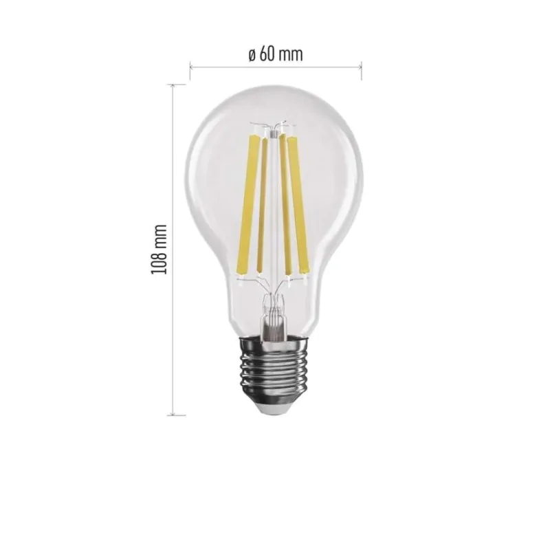 Żarówka LED z gwintem E27 Emos to energooszczędne źródło światła wyposażone w ozdobne filamenty. Żarówka LED działa z mocą 11W i jest zamiennikiem tradycyjnej żarówki o mocy 100W. Świecić nam będzie ciepłą barwą światła o temperaturze 2700K i strumieniu świetlnym 1521lm. Przybliżony czas trwałości dekoracyjne ściemnialnej żarówki LED to około 25000h. Żarówka rozsyła swiatło pod kątem 320°. Objęta jest 3 gwarancją producenta i należy do klasy energetycznej D. Produkt można ściemniać w zakresie od 10 do 100% jasności.