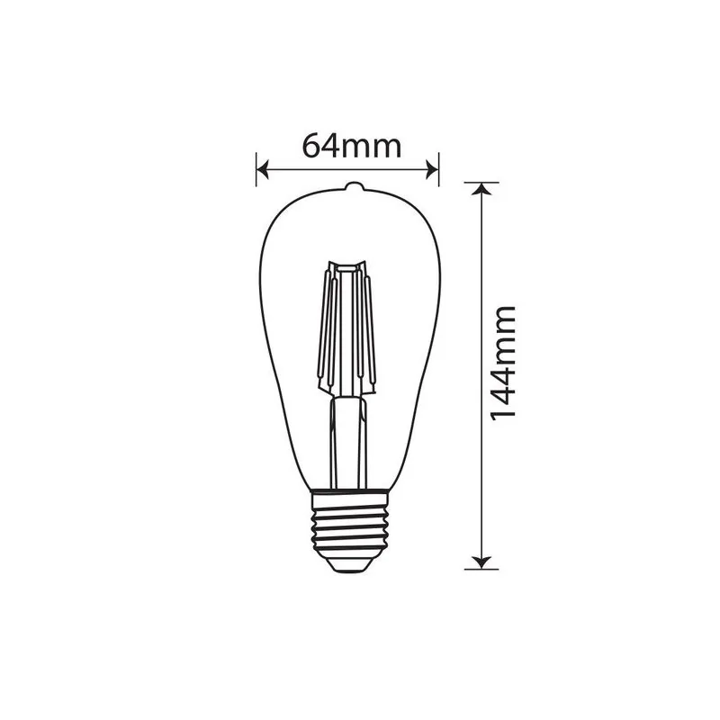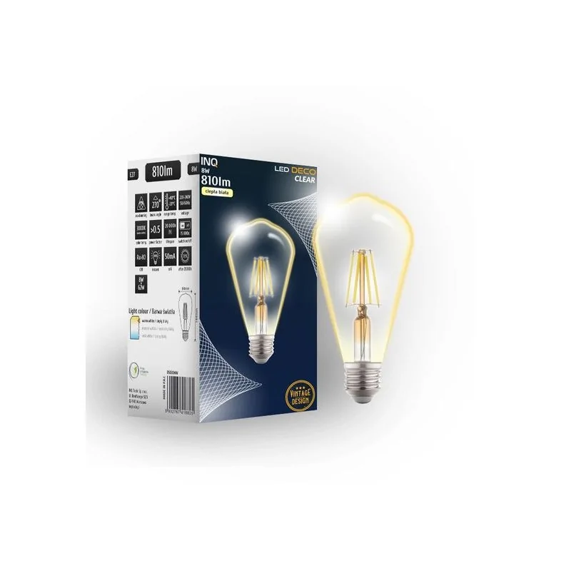 Żarówka led ST64 z filamentami marki INQ działa z mocą 8W (odpowiednik 62W). Produkt świeci ciepłym białym światłem o temperaturze barwowej 3000K i strumieniu świetlnym równym 810 lumenów. Żarówka led wyposażona została w tradycyjny gwint E27 i doskonale spisze się w lampach z widocznym źródłem światła. Wewnątrz przezroczystej bańki umieszczone zostały ozdobne filamenty, które dodają ciekawego wyglądu żarówce. Prezentowane źródło światła led charakteryzuje się energooszczędnością. Produkt rozsyła światło pod kątem 270 stopni. Wymiary bańki ST64 to 64x144mm. Model dostęny także w wersji z neutralnym światłem- 4000K.
