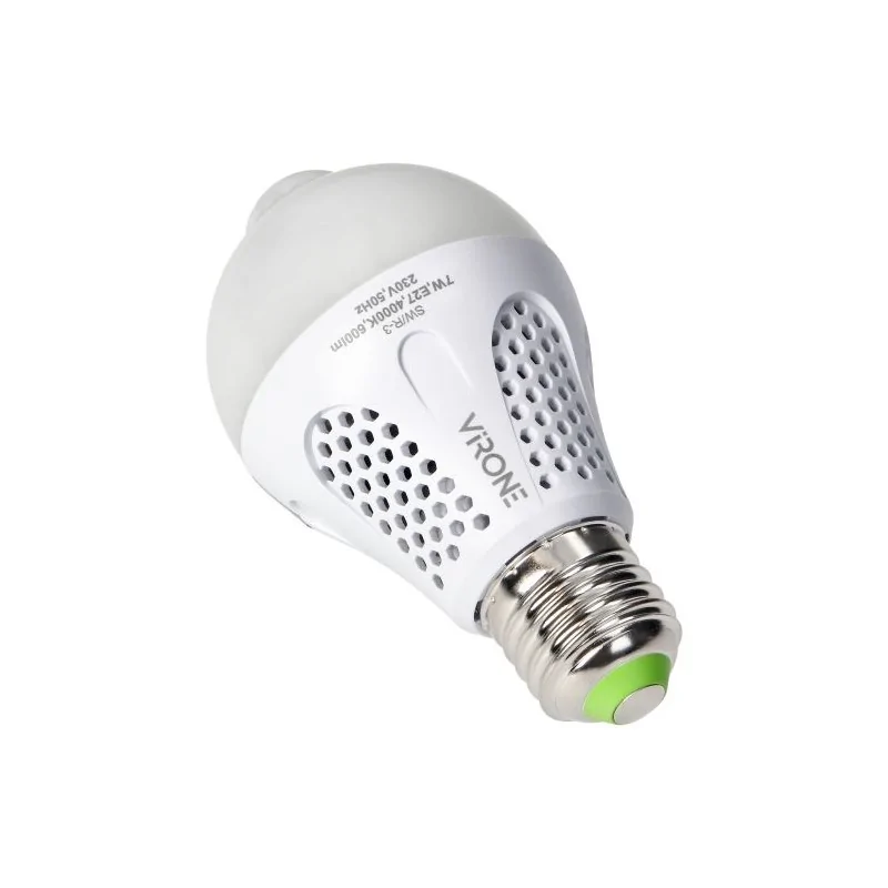 Nowoczesna żarówka LED NAMIB o trzonku E27 marki ORNO, z wbudowanym czujnikiem ruchu PIR, wyposażona jest w diody LED SMD. Czujnik załącza i wyłącza światło po wykryciu ruchu w obszarze detekcji 6 metrów, przy zmniejszonym natężeniu światła <20lux. Czas świecenia po wykryciu ruchu: ok.60 sek. Nie wymaga instalacji. Energooszczędne źródło światła LED, świeci o mocy 7W neutralną barwą światła, równą temperaturze barwowej 4000K. Strumień świetlny wynosi 1480lm.