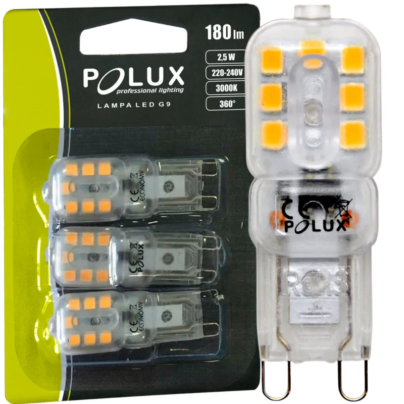 Led-owa żarówka marki POLUX to niewielkie źródło światła świecące ciepłą białą barwą o temperaturze barwowej 6500K i strumieniem świetlnym równym 180 lumenów. Produkt wyposażony został w trzonek G9. Żarówki led to idealny zamiennik tradycyjnego źródła światła, pomagają zaoszczędzić nawet do 80% energii. Prezentowana żarówka led działa z mocą 2,5W, a jej wymiary to Ø16,5x46 mm. Przybliżony czas działania źródła światła G9 to około 25 000h. Żarówka świetnie spisze się w lampach w każdym pomieszczeniu. Klasa G. W komplecie 3 sztuki żarówek.