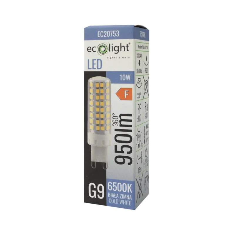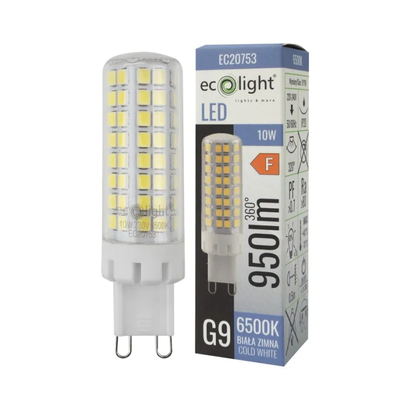 Żarówka LED EC20751 to nowoczesne źródło światła o zimnej barwie (6500K), które idealnie sprawdzi się w przestrzeniach użytkowcych czy biurowych wnętrzach. Dzięki mocy 10W oferuje jednocześnie wysoką wydajność świetlną 950 lumenów i oszczędność energii. Kompaktowy rozmiar i standardowy trzonek G9 ułatwiają montaż w różnych oprawach. Szeroki kąt świecenia 320° gwarantuje równomierne rozprowadzenie światła w całym pomieszczeniu, a trwałość aż do 25 000 godzin pozwala zapomnieć o częstych wymianach. Trzonek G9 pasuje do wielu nowoczesnych opraw oświetleniowych, a transparentny klosz nadaje eleganckiego wyglądu.
