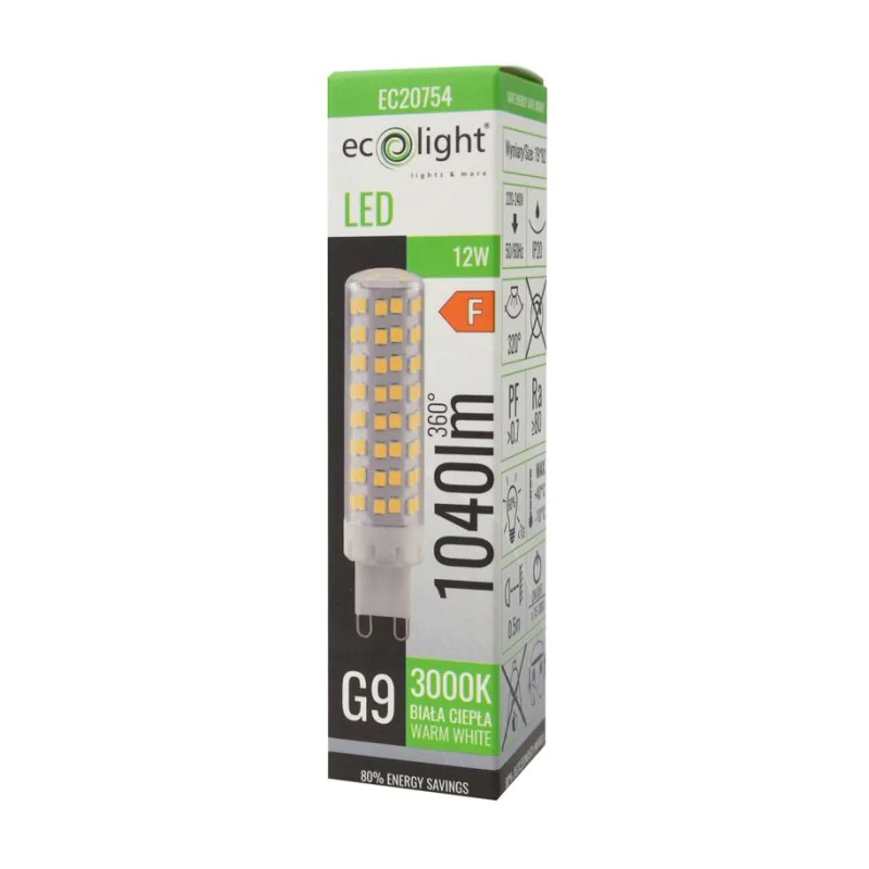 Żarówka LED EC20754 to nowoczesne źródło światła o ciepłej barwie (3000K), które idealnie sprawdzi się w domowych i biurowych wnętrzach. Dzięki mocy 12W oferuje jednocześnie wysoką wydajność świetlną 1040 lumenów i oszczędność energii. Kompaktowy rozmiar i standardowy trzonek G9 ułatwiają montaż w różnych oprawach. Szeroki kąt świecenia 320° gwarantuje równomierne rozprowadzenie światła w całym pomieszczeniu, a trwałość aż do 25 000 godzin pozwala zapomnieć o częstych wymianach. Trzonek G9 pasuje do wielu nowoczesnych opraw oświetleniowych, a transparentny klosz nadaje eleganckiego wyglądu.