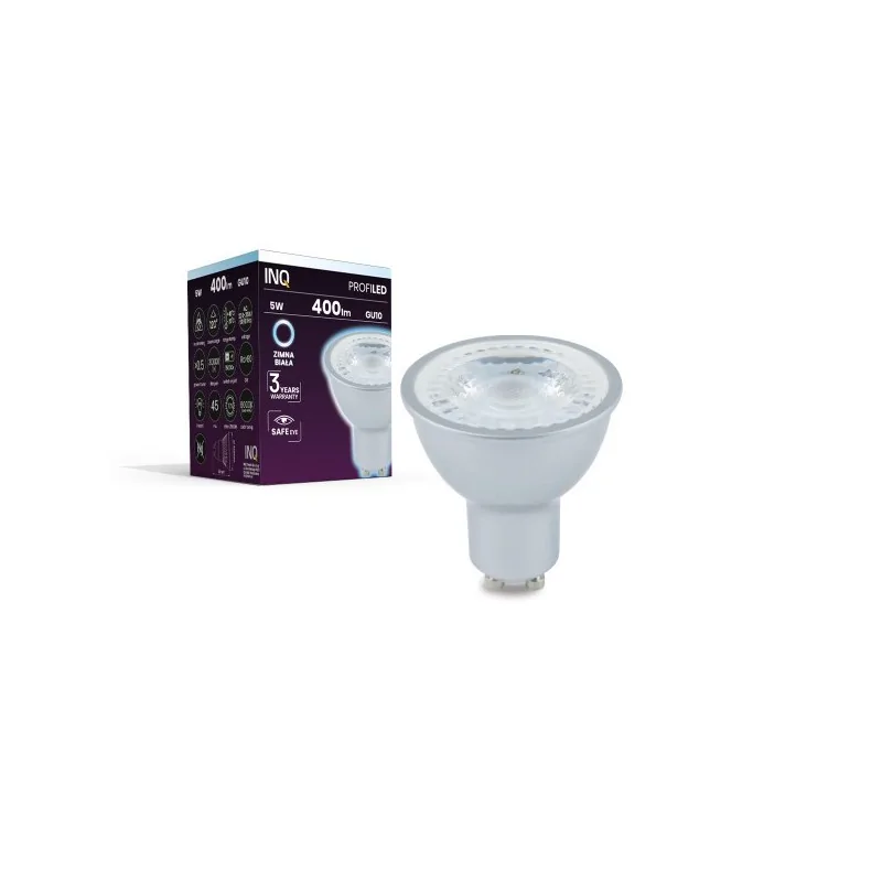 Energooszczędne źródło światła LED z gwintem GU10 od marki INQ to wysokiej jakości oświetlenie bezpieczne dla oczu. To żarówka z ceramiczną obudową, objęta 3-letnią gwarancją producenta. Prezentowane oświetlenie emituje zimną, białą barwę 6000K, przez co zapewnia doskonałą widoczność w miejscu przeznaczenia. Ze względu na klasę szczelności IP20 żarówka przystosowana została do użytku wewnętrznego. Oświetlenie charakteryzuje się bardzo długą żywotnością sięgającą aż 30000 godzin. Jest to energooszczędne źródło światła należące do wysokiej klasy energetycznej A+.