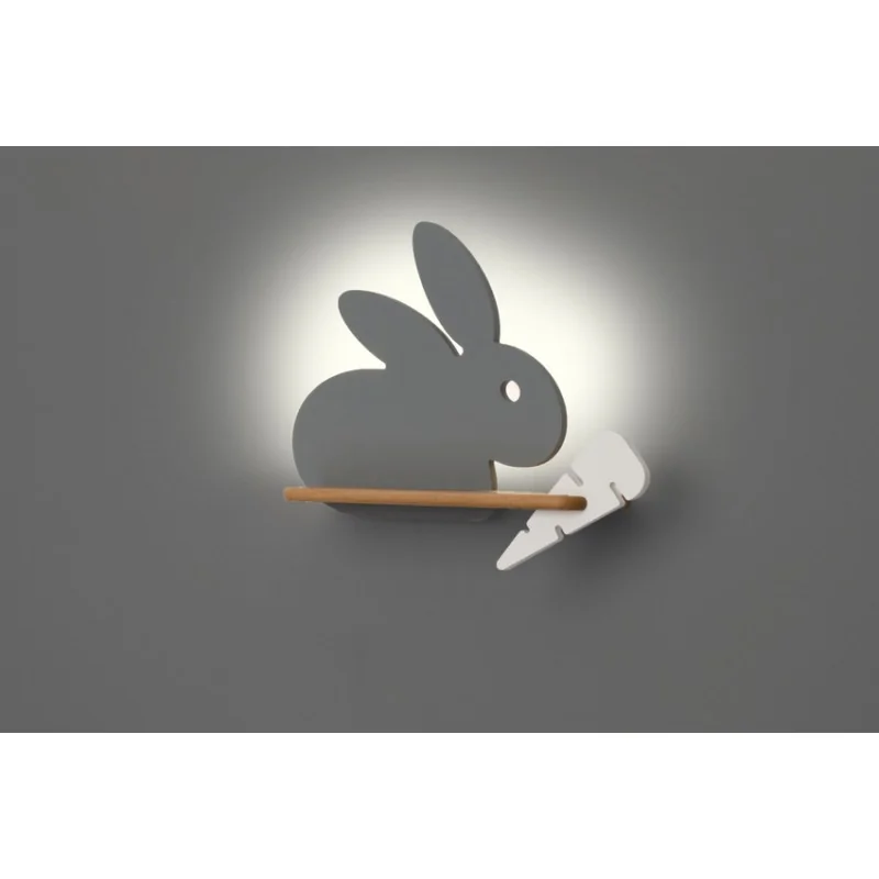 Kinkiet 21-84743 RABBIT marki Candellux to unikatowe oświetlenie, które dedykowane jest do pokoi dziecięcych, ale z pewnością spodoba się również miłośnikom faunistycznych wzorów. Niestandardowa konstrukcja w kształcie szarego królika i białej marchewki posiada wbudowany LED oraz funkcjonalną półkę. Jest to energooszczędne oświetlenie LED, które pobiera moc 5W i emituje neutralną barwą światła na poziomie 250 lm. Kinkiet posiada wymiary takie jak: szerokość - 40cm oraz wysokość - 29cm. Produkt objęty jest gwarancja producenta. Lampka może być świetnym prezentem urodzinowym, świątecznym czy upominkiem baby shower.