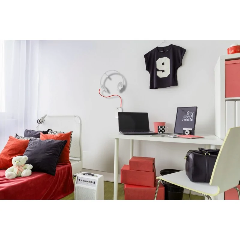 Lampę ścienna ML019 TUNE marki EKO-LIGHT, wykonana jest z połączenia dwóch tworzyw: metalu oraz akrylu. Wysokość tego modelu jest równa 80cm, a szerokość lampy to 40cm. Po zamontowaniu, dzięki specjalnej nakładce, lampa znajduje się w odległości 10cm od ściany. Kinkiet ma jeden punkt świetlny LED, który jest zintegrowany. Maksymalna moc tego modelu wynosi 10W, co odpowiada tradycyjnej żarówce 55W. Jasność plasuje się na poziomie 700 lumenów, a temperatura barwowa ma wartość 4000K. Oznacza to, że lampa daje światło o neutralnej, przyjemnej dla oka, białej barwie. Oświetlenie ścienne to nowoczesny design i funkcjonalność w jednym. Półokrągły kształt klosza przywodzący na myśl słuchawki sprawia, że lampa będzie idealnym dopełnieniem sypialni miłośnika muzyki. Połączenie szarości i czerwieni doskonale komponuje się ze ścianą w jednolitym odcieniu.
