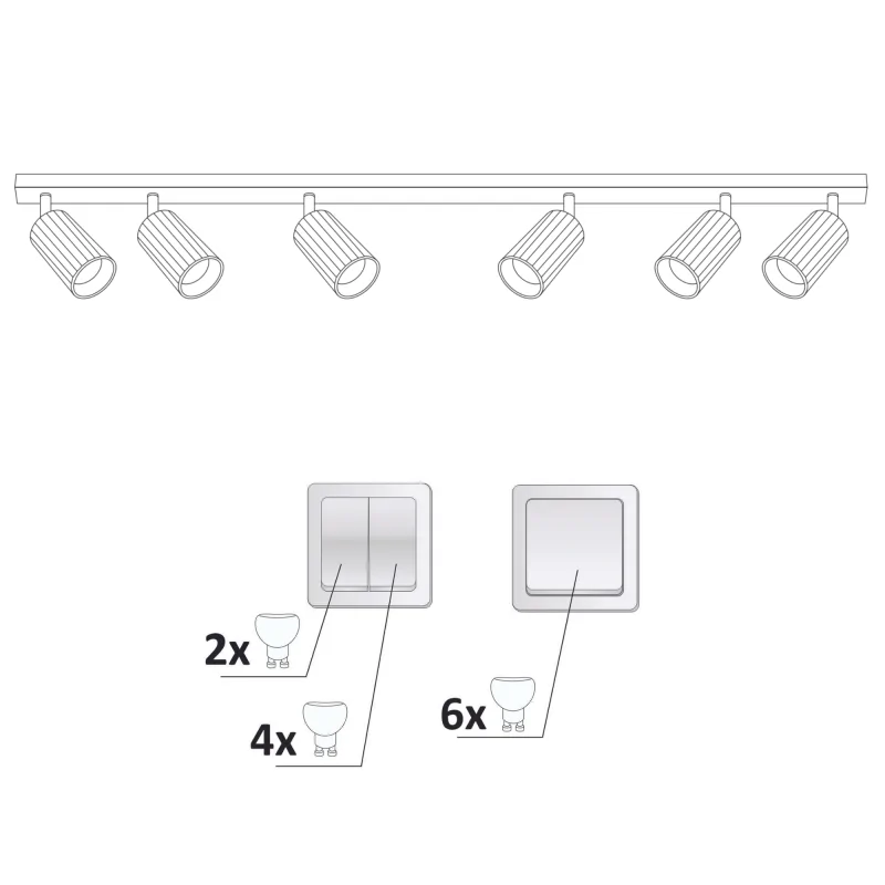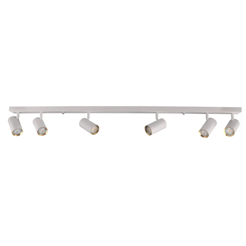 Sufitowo-ścienna oprawa do montażu natynkowego NICEA to nowoczesna forma oświetlenia w kształcie liistwy z 6 tubami o średnicy 5,5cm. Obudowa w kolorze białym doskonale wkomponuje się w każdą aranżację wnętrza, a złoty spód doda jej charakteru. Prezentowana natynkowa oprawa sufitowa sprzedawana jest bez źródła światła w zestawie, co pozwala na samodzielne dobranie żarówki do własnych potrzeb. Biała oprawa sufitowo-ścienna przystosowana jest do współpracy z żarówką GU10 o maksymalnej mocy 10W led. Wymiary oprawy to 5,5x5,5x10cm. Tubka ze zdobioną powierzchnią wykonana jest z aluminium. IP20. Produkt dostępny także w wersji czarno-złotej. Szerokość listwy to 119,5cm.