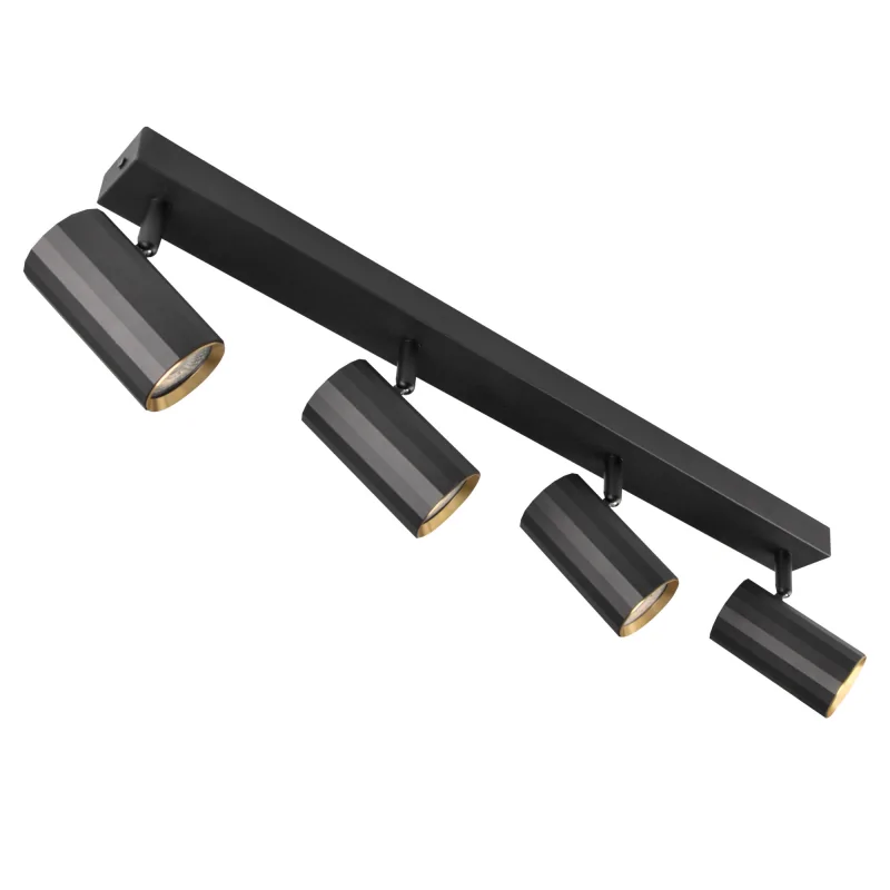 Sufitowo-ścienna oprawa do montażu natynkowego NICEA to nowoczesna forma oświetlenia w kształcie liistwy z 4 tubami o średnicy 5,5cm. Obudowa w kolorze czarnym doskonale wkomponuje się w każdą aranżację wnętrza, a złoty spód doda jej charakteru. Prezentowana natynkowa oprawa sufitowa sprzedawana jest bez źródła światła w zestawie, co pozwala na samodzielne dobranie żarówki do własnych potrzeb. Biała oprawa sufitowo-ścienna przystosowana jest do współpracy z żarówką GU10 o maksymalnej mocy 10W led. Wymiary oprawy to 5,5x5,5x10cm. Tubka ze zdobioną powierzchnią wykonana jest z aluminium. IP20. Produkt dostępny także w wersji biało-złotej. Szerokość listwy to 59,5cm.