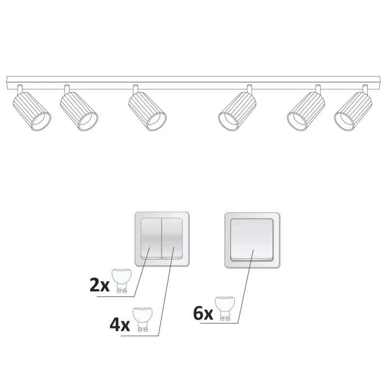 Sufitowo-ścienna oprawa do montażu natynkowego NICEA to nowoczesna forma oświetlenia w kształcie liistwy z 6 tubami o średnicy 5,5cm. Obudowa w kolorze czarnym doskonale wkomponuje się w każdą aranżację wnętrza, a złoty spód doda jej charakteru. Prezentowana natynkowa oprawa sufitowa sprzedawana jest bez źródła światła w zestawie, co pozwala na samodzielne dobranie żarówki do własnych potrzeb. Biała oprawa sufitowo-ścienna przystosowana jest do współpracy z żarówką GU10 o maksymalnej mocy 10W led. Wymiary oprawy to 5,5x5,5x10cm. Tubka ze zdobioną powierzchnią wykonana jest z aluminium. IP20. Produkt dostępny także w wersji biało-złotej. Szerokość listwy to 119,5cm.