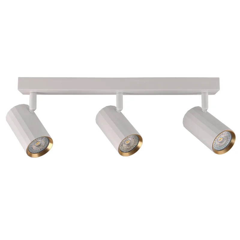 Sufitowo-ścienna oprawa do montażu natynkowego NICEA to nowoczesna forma oświetlenia w kształcie liistwy z tubami o średnicy 5,5cm. Obudowa w kolorze białym doskonale wkomponuje się w każdą aranżację wnętrza, a złoty spód doda jej charakteru. Prezentowana natynkowa tuba sufitowa sprzedawana jest bez źródła światła w zestawie, co pozwala na samodzielne dobranie żarówki do własnych potrzeb. Biała oprawa sufitowo-ścienna przystosowana jest do współpracy z żarówką GU10 o maksymalnej mocy 10W led. Wymiary oprawy to 5,5x5,5x10cm. Tubka ze zdobioną powierzchnią wykonana jest z aluminium. IP20. Produkt dostępny także w wersji czarno-złotej. Szerokość listwy to 39cm.