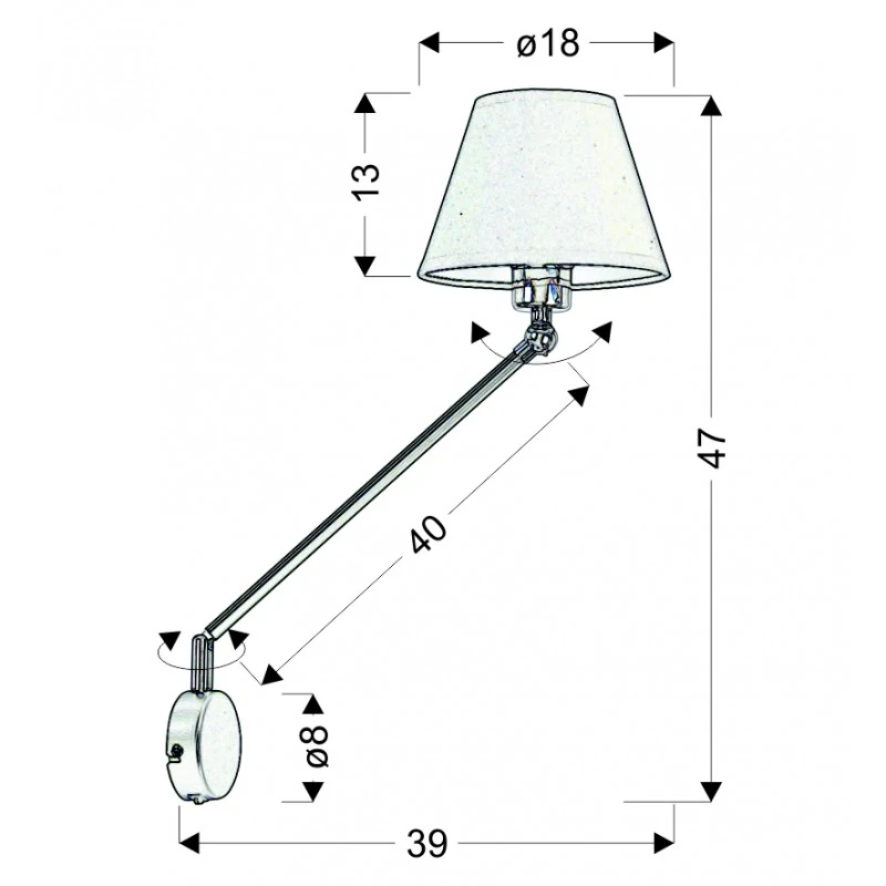 - Materiał: abażur tkanina/PVC na obrotowym ramieniu, podstawa stalowa