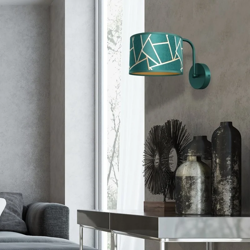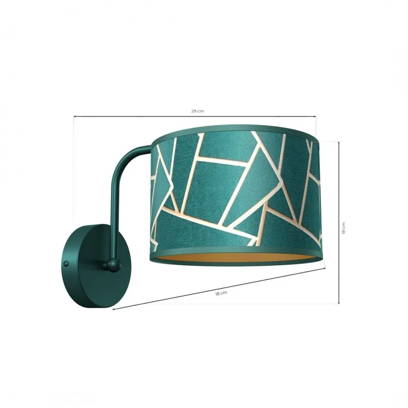 Kinkiet ZIGGY MLP7572 marki EKO-LIGHT, o nowoczesnej konstrukcji łączy szykowne odcienie butelkowej zieleni ze złotem. Ponadczasowa oprawa dedykowana jest szczególnie do wnętrz w stylu glamour. Wykonana została z tkaninowego klosza oraz metalowej podstawy. Lampa ścienna przystosowana jest na jedną żarówkę o gwincie E27 do max mocy 60W (brak w zestawie). Wymiary wynoszą: 18cm wysokości i 29cm długości. Jest to dodatkowe oświetlenie w pomieszczeniu, dlatego polecamy wybrać lampy sufitowe oraz lampki stołowe z serii ZIGGY, które są dostępne w kolorze zielonym, różowym, białym.