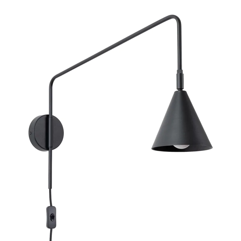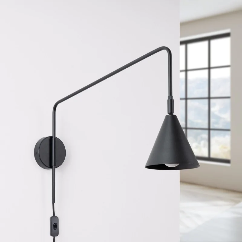 NOX to nowoczesny kinkiet o wyjątkowo lekkiej formie i wyraźnym charakterze. Prosty, metalowy wysięgnik zakończony geometrycznym, stożkowym kloszem tworzy intrygującą kompozycję, która świetnie sprawdzi się w nowoczesnych, skandynawskich czy industrialnych aranżacjach.