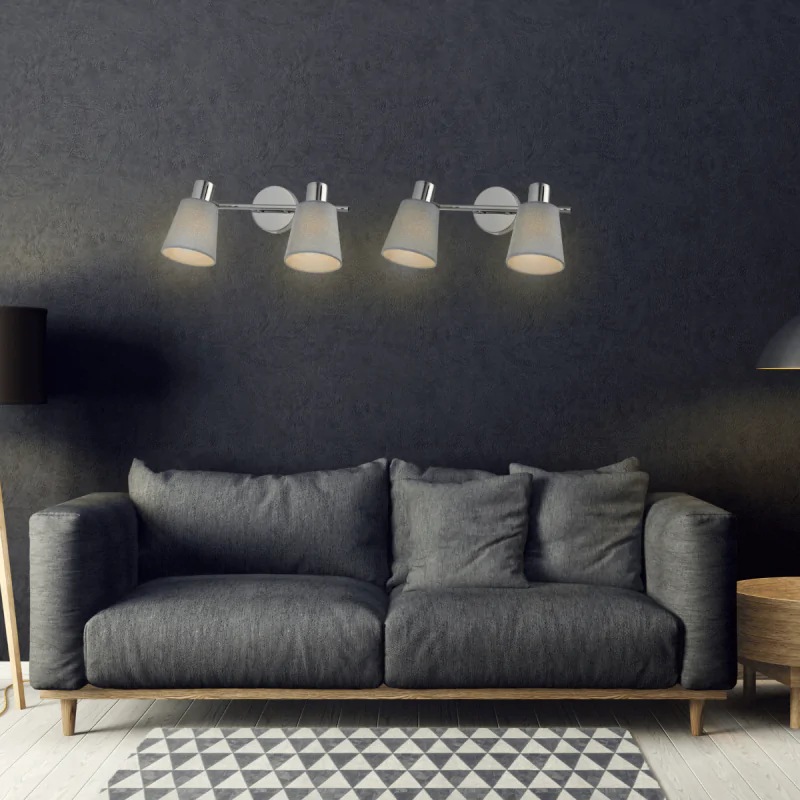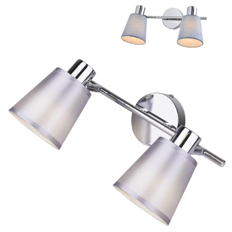 Dzięki starannemu wykonaniu z materiałów najwyższej jakości, takich jak stalowa podstawa i tkaninowe klosze zabezpieczone PCV, kinkiet wyróżnia się trwałością i łatwością w pielęgnacji. Chromowane wykończenie dodaje całości wyrafinowanego wyglądu, podkreślając nowoczesny charakter lampy. Kompaktowe wymiary sprawiają, że model ten doskonale sprawdzi się zarówno w mniejszych, jak i przestronnych wnętrzach, oferując uniwersalność zastosowania.