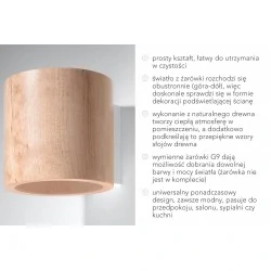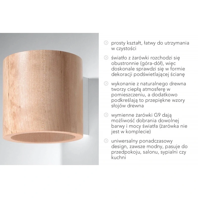 Kinkiet tuba naturalne drewno Orbis marki Sollux lighting wpasuje się do niejednego wnętrza. Dzięki rozproszeniu światła góra-dół stworzy wyjątkowy klimat w salonie, czy w sypialni. Obudowa lampy ściennej wykonana została z naturalnego drewna. Dostępny jest jeszcze kolor modelu beton. Kinkiet dzięki wymiennym źródłom światła o gwincie G9 daje nam możliwość doboru jego barwy i mocy światła. Pamiętajmy, że żarówka nie jest dołączona do zestawu. Polski produkt objęty 5-letnią gwarancją producenta.