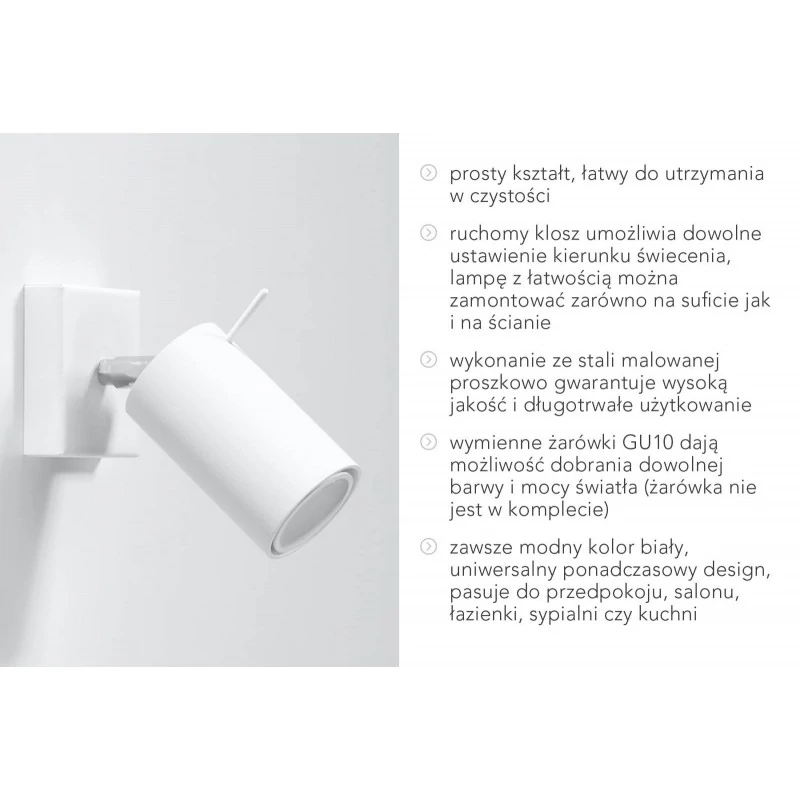 Biały kinkiet RING marki SOLLUX to nowoczesne oświetlenie o oryginalnym kształcie tuby. Idealnie spisze się w salonie, sypialni czy jadalni. Biały kolor wkomponuje się w każde pomieszczenie. Lampa ścienna przystosowana jest do pracy z żarówkami z trzonkiem GU10 - brak w zestawie. Ze względu na stopień odporności IP20 kinkiet może być zastosowany tylko wewnątrz pomieszczeń.