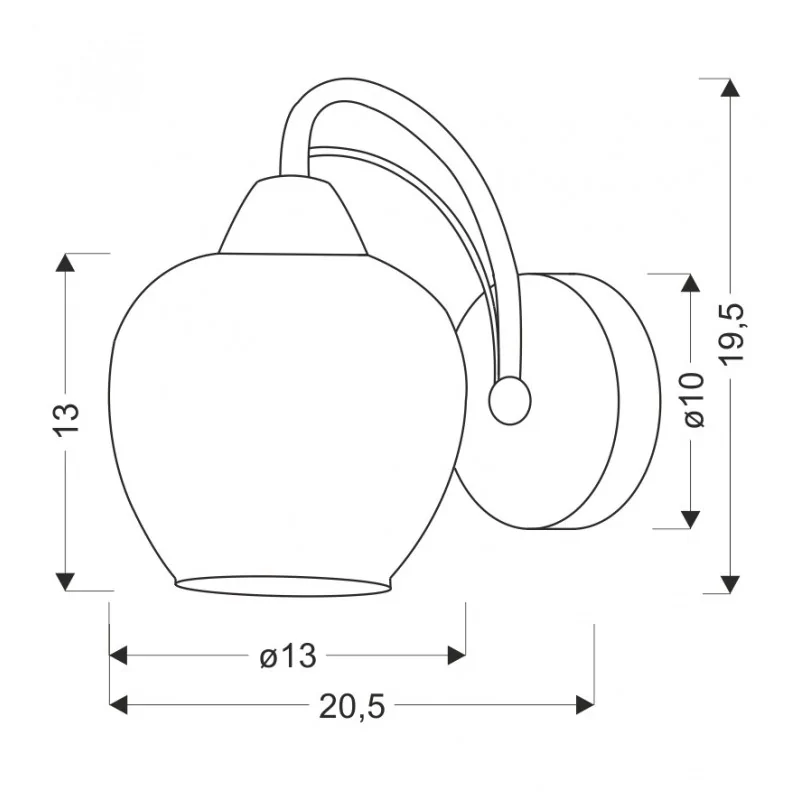 Materiał wykonania: podstawa stalowa, klosz szklany. Kolor podstawy: patynowy. Wysokość: 19,5. Szerokość: 20,5. Głębokość: 13. Wymiary (wys. x szer. x gł.): 19,5x20,5x13. Waga netto: 0,35. Rodzaj trzonka: E27.