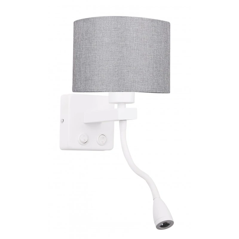 Nowoczesny kinkiet Polo 21-75383 marki Candellux, wyposażony jest w dodatkowe światło do czytania. Składa się z podstawy metalowej w kolorze białego matu oraz eleganckiego abażura w kolorze szarym. Ruchome wystające w dolnej części ramię, możemy dowolnie wyginać, nakierowując źródło światła w dowolnym kierunku, dzięki temu, że zawiera aż dwa niezależne źródła światła. Dwa przyciski światła, które umożliwiają dowolność włączania niezależnego światła zamiennie lub obydwu jednocześnie, umieszczone są na froncie podstawy w miejscu łatwo dostępnym i wygodnym, zwłaszcza podczas korzystania z oprawy przy łóżku. Lampa ścienna przystosowana jest na żarówkę E27 (brak w zestawie) oraz posiada wbudowane źródło światła LED o mocy 2W, które charakteryzuje się energooszczędnością.