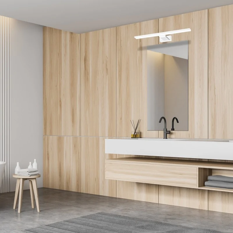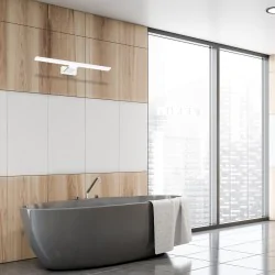 Nowoczesna propozycja oświetleniowa SHINE ML3878 marki EKO-LIGHT, stworzona szczególnie nad lustra. Stopień odporności IP44, pozwala na zamontowanie lampy w łazience lub miejscach o podwyższonej wilgotności. Wyposażona jest w źródło światła LED, które charakteryzuje się energooszczędnością, pobiera moc 13,8W. Funkcjonalnym rozwiązaniem jest możliwość wymiany LED-u. Kinkiet ścienny mierzy 60cm szerokości i 4cm wysokość. Lampa daje neutralne światło, równe temperaturze barwowej - 4000K, a strumień świetlny wynosi 966 lumenów. Kinkiet dostępny jest także w kolorze chromowym i czarnym.