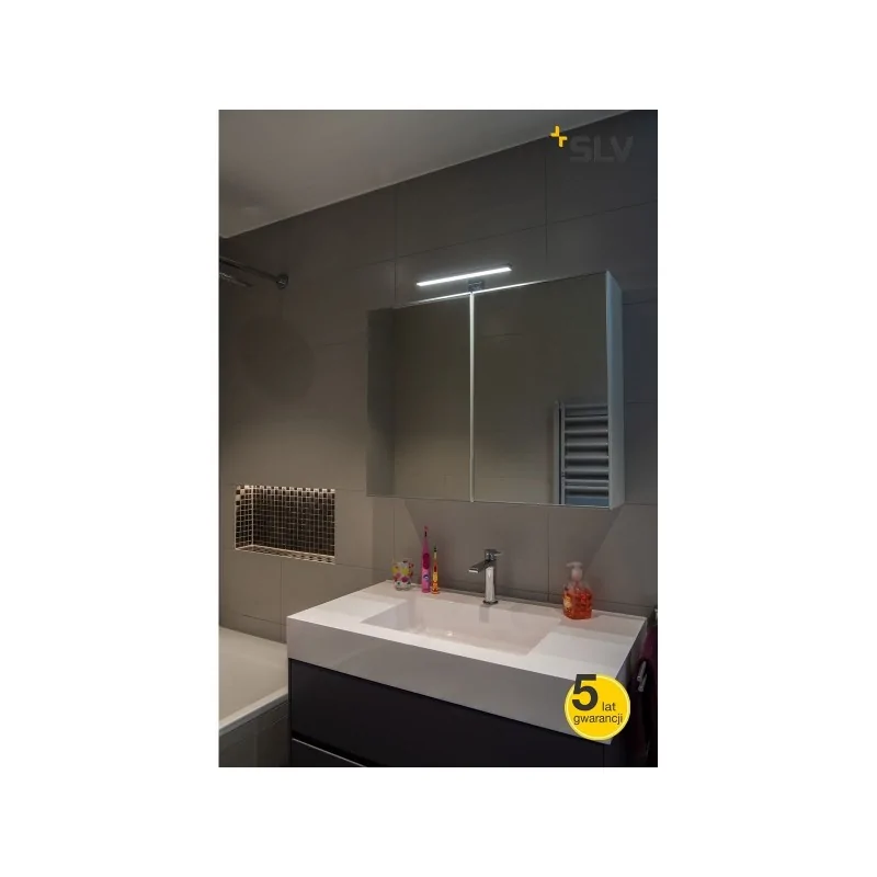 Lampa nad lustro marki SPOTLINE wykonana z aluminium w kolorze chrom posiada wbudowane źródło światła LED emitujące neutralne, białe światło 4000K z mocą strumienia świetlnego 280 lumenów. Taka barwa światła zapewnia doskonałą widoczność pozwalając tym samym na wykonywanie codziennych czynności wymagających precyzji. Podwyższona klasa szczelności IP44 sprawia, że Kinkiet nad lustro SPOTLINE bez problemu może być wykorzystywany jako oświetlenie łazienkowe. Lampka charakteryzuje się również bardzo długą żywotnością. Czas pracy oprawy ściennej wynosi około 30000 godzin.