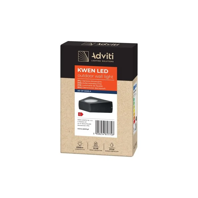 Lampa elewacyjna KWEN w grafitowym (szarym) kolorze posiada wbudowane diody LED i wyróżnia się prostym, ale nowoczesnym kształtem. Idealnie nadaje się do podświetlenia ścian budynków, altan lub tarasów. Kilka takich opraw zestawionych ze sobą w pewnej odległości, na przykład wzdłuż podjazdu, zagwarantuje bardzo ciekawy i przyciągający uwagę efekt wizualny. Zewnętrzna lampka świeci naturalnym, białym światłem 4000K o mocy 6W ze strumieniem świetlnym na poziomie 260 lumenów. LED-owa lampa elewacyjna posiada stopień ochrony IP65, dzięki czemu świetnie sprawdzi się na elewacjach domów. Technologia LED zastosowana w elewacyjnej lampie dekoracyjnej pozwala zaoszczędzić nawet do 80% energii w porównaniu do tradycyjnych źródeł światła. Oferowana prostokątna lampa elewacyjna LED z tworzywa sztucznego to nowoczesne, dekoracyjne rozwiązanie przeznaczone do montażu na ścianie.