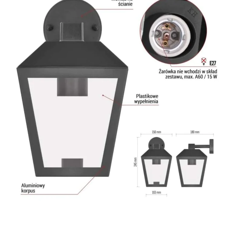 Wykonanie z wytrzymałego aluminium (korpus) i tworzywa sztucznego( osłonki) zapewnia długą żywotność i odporność na zmienne warunki atmosferyczne. Stopień ochrony IP44 zabezpiecza kinkiet przed kurzem i wilgocią, co sprawia, że doskonale sprawdzi się w zewnętrznych przestrzeniach narażonych na wpływ warunków pogodowych. Możliwość zastosowania żarówek LED E27 pozwala na dostosowanie mocy i barwy światła do własnych preferencji, a jednocześnie jest energooszczędnym rozwiązaniem.