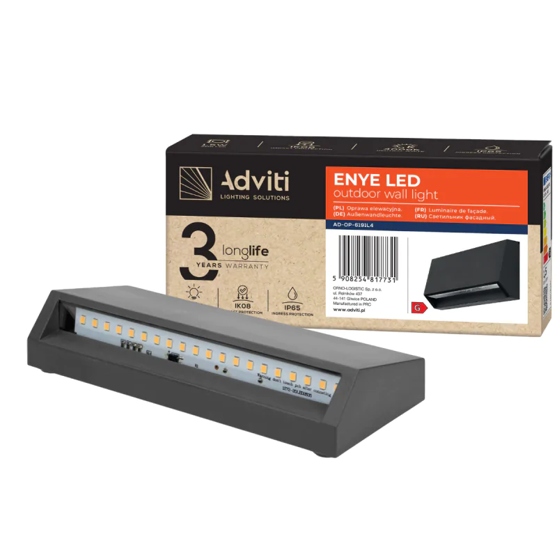 Kinkiet zewnętrzny elewacyjny LED ENYE to nowoczesne rozwiązanie, które doskonale sprawdzi się jako oświetlenie fasady domu, tarasu czy ogrodu. Minimalistyczny design i kompaktowe wymiary sprawiają, że lampa harmonijnie komponuje się z elewacją, dodając jej elegancji i nowoczesnego charakteru. Światło skierowane w dół subtelnie podkreśla architekturę budynku, tworząc efektowną i funkcjonalną iluminację, która poprawia widoczność i bezpieczeństwo wokół posesji.