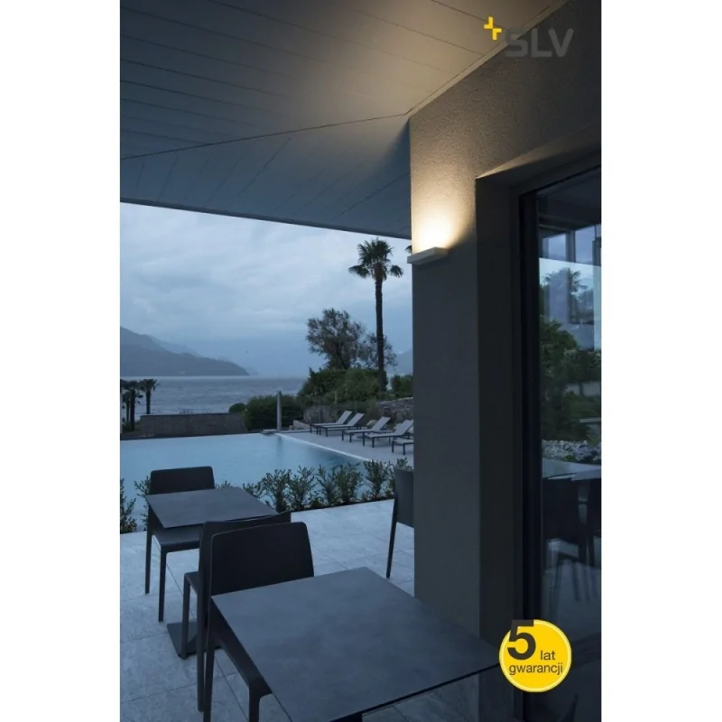 Kinkiet LED na zewnątrz PEMA LED 1002071 firmy SPOTLINE jest w srebrno szarym kolorze i emituje ciepłą białą barwą światła, której temperatura barwowa wynosi 3000K. Strumień świetlny jest równy 450 lumenów, a szacowany czas trwałości zintegrowanego w oprawie źródła światła to około 30000h. Lampa posiada wysoki stopień ochronności IP54, dzięki czemu bez problemu może być zastosowana na zewnątrz. Kinkiet idealnie spisze się np. na tarasach restaracji.