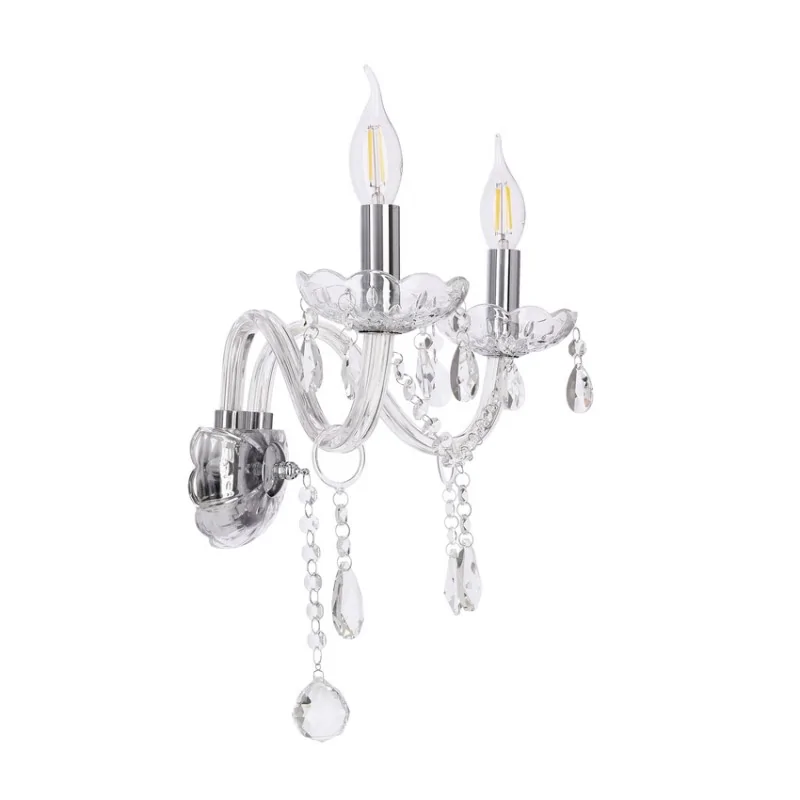 Nowoczesna lampa ścienna Cristallo firmy Candellux przystosowany został do dwóch źródeł światła z trzonkiem E14 (brak w zestawie). Produkt idealnie sprawdzi się na salach bankietowych, w domach weselnych, gdzie wygląd wnętrz pełni ważną rolę. Srebrną lampę ścienną można również zastosować w domu, dobierając do niej odpowiednie żarówki z trzonkiem E14. Kinkiet wykończony został kryształowymi zdobieniami, dzięki czemu oprawa przybiera jeszcze bogatszy design. Produkt objęty został gwarancją producenta i dostępny jest również w wersji pojedynczej.