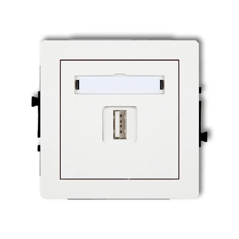 Pojedyncze gniazdo USB-AA koloru białego serii DECO firmy KARLIK, przeznaczone do montażu podtynkowego. Gniazdo wymaga dokupienia ramki serii DECO firmy KARLIK.